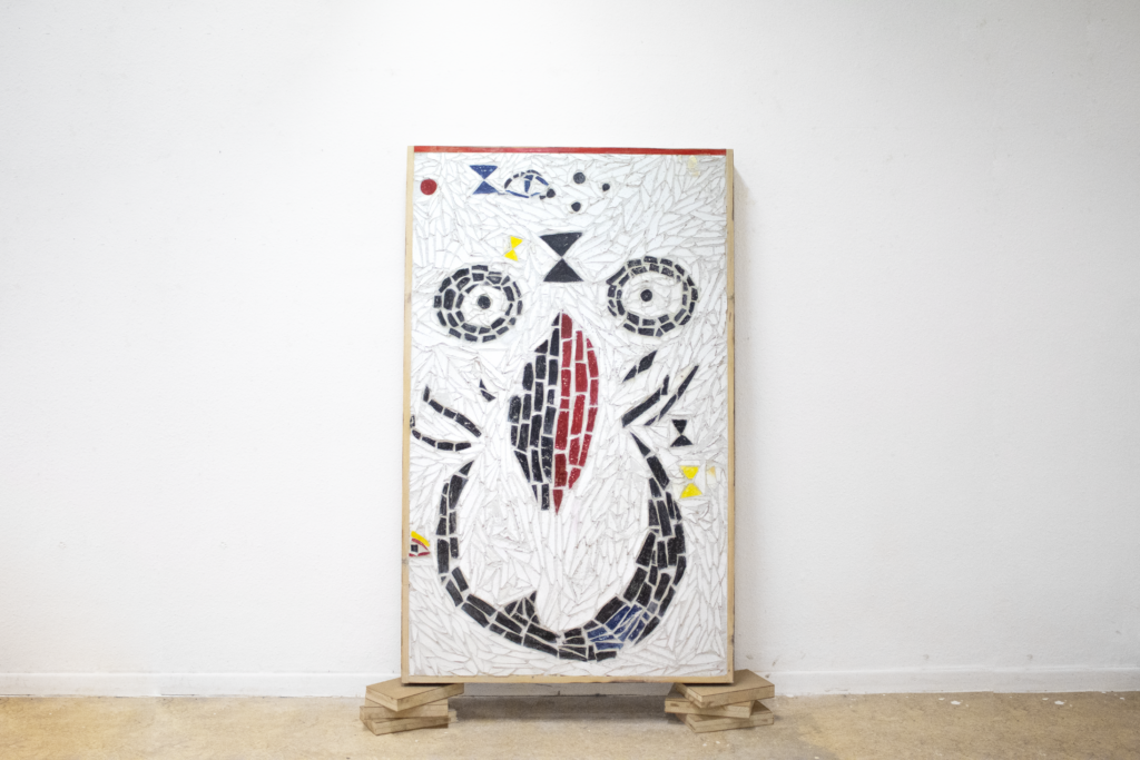 J’ai demandé à chacun d’eux leurs travaux les plus récents ou préférés. Tous avaient comme particularité qu’il s’agissait de représenter autre chose : un dessin préexistant, un film, une peinture, du déjà-là. L’un dessinait des images de films, d’acteurs ou de bandes dessinées tout comme moi, avant. L’autre me montrait ses tags, où là aussi, il y avait beaucoup d’éléments “toonesques”, d’extraits de comics, des typos bien grasses, bien stylisées. Un autre, encore, me montre ses macrophotos de plantes, qu’il passe un temps maladif à photoshoper, à imprimer sur mille papiers, avec mille encres, juste pour “tester”. Elle, la plus créative selon les dires : étant petite, elle reproduisait des dessins de bouquins d’histoire allemands, c’est comme ça qu’elle a commencé. Désormais, elle ne crée plus, mais elle combat sa mauvaise mémoire en réécrivant des livres entiers, page par page, tous les soirs. Quand je mets un pas de côté, je me rends compte que nous avons tous eu, plus ou moins, cette propension à ne jamais dépasser le cadre “strict” de la reproduction, de l’hommage, de la copie. Évidemment, le résultat est très différent, et le plaisir réside dans le faire, la quantité “reconnaissable”, la dose de “bien fait”. Moi-même, mes dessins ne dépassaient jamais ce cadre jusqu’à ma première année de prépa. Cette mosaïque, inspirée du tableau de Miró, a ce talent particulier qu’elle est capable de créer la joie chez les uns, comme de représenter le comble du mauvais goût pour d’autres. Moi-même, je ne lui prêtais pas grande affection jusqu’à ce que je pose un autre regard. Il s’agit ici d’une copie, conformément à la coutume.