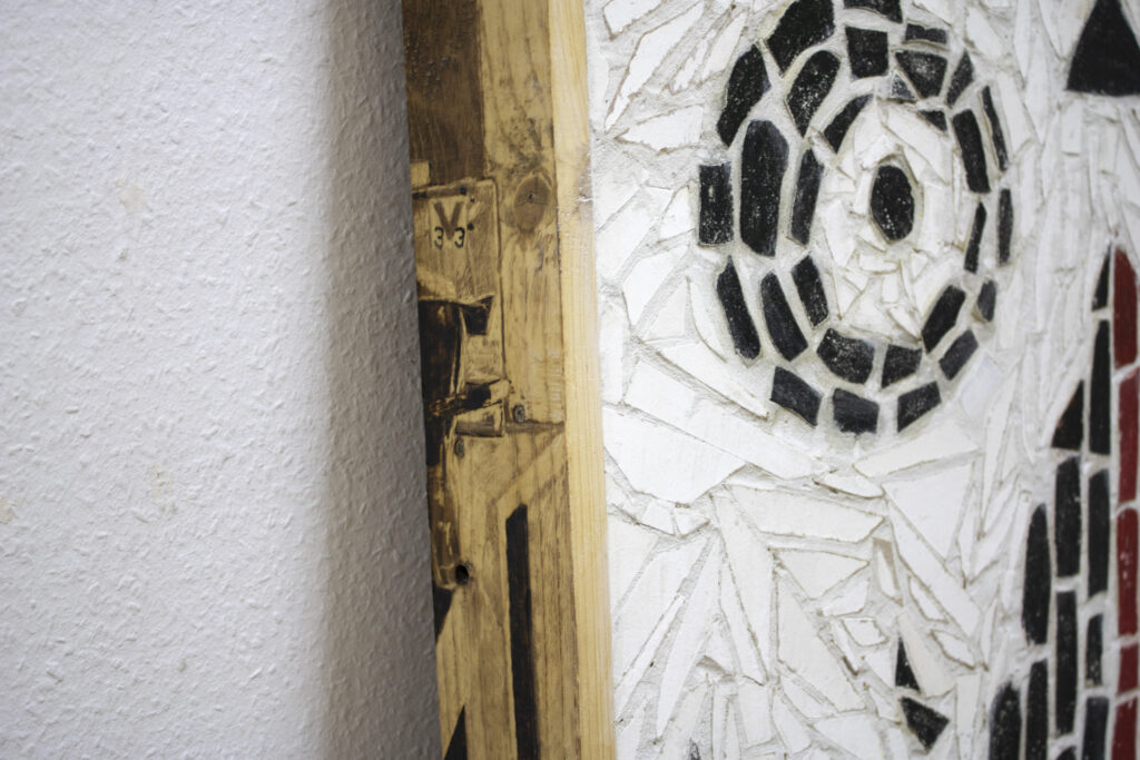 Contre-facon, colle à carrelage, peinture et pyrogravure sur bois, 160x85x7, 2025