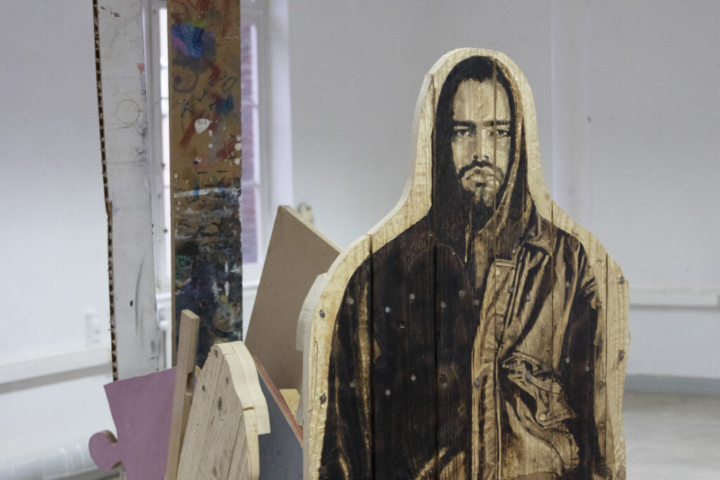Je peux vous parler de ”la chute” elle récupère un autoportrait en pyrogravure que j’avais fais lorsque je me questionnais sur l’outil, la mise en discours de sois, la violence symbolique.